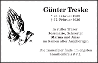 Günter Treske * 25. Februar 1939 + 27. Februar 2026 In stiller Trauer: Rosemarie, Schwester Marina und Jonas im Namen aller Angehörigen Die Trauerfeier findet im engsten Familienkreis statt.