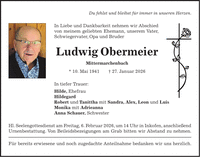 Du fehlst und bleibst für immer in unseren Herzen. In Liebe und Dankbarkeit nehmen wir Abschied von meinem geliebten Ehemann, unserem Vater, Schwiegervater, Opa und Bruder Ludwig Obermeier Mittermarchenbach * 10. Mai 1941 + 27. Januar 2026 In tiefer Trauer: Hilde, Ehefrau Hildegard Robert und Tanittha mit Sandra, Alex, Leon und Luis Monika mit Adrieanna Anna Schauer, Schwester Hl. Seelengottesdienst am Freitag, 6. Februar 2026, um 14 Uhr in Inkofen, anschließend Urnenbestattung. Von Beileidsbezeigungen am Grab bitten wir Abstand zu nehmen. Für bereits erwiesene und noch zugedachte Anteilnahme bedanken wir uns herzlich.