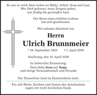 Es war so reich Dein Leben an Mühe, Arbeit, Sorg und Last. Wer Dich gekannt, muss Zeugnis geben, wie fleißig Du geschaffen hast. Der Kreis eines erfüllten Lebens hat sich geschlossen. Wir nahmen Abschied von Herrn Ulrich Brunnmeier * 29. September 1950 + 1. April 2026 Stallwang, den 16. April 2026 In liebevoller Erinnerung: Dein Sohn Sven mit Tanja und übrige Verwandtschaft und Freunde Die Trauerfeier fand im Familienkreis statt. Für alle Worte, Zeichen und Gesten der Anteilnahme sagen wir recht herzlichen Dank.