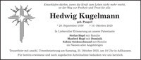 Einschlafen dürfen, wenn die Kraft zum Leben nicht mehr reicht, ist der Weg zur Freiheit und Trost für alle. Hedwig Kugelmann geb. Pangerl * 20. September 1936 + 10. Oktober 2025 In Liebevoller Erinnerung an unsere Patentante Stefan Hupf mit Familie Manfred Hupf mit Dominik Sabine Seidenschwand mit Familie im Namen aller Angehörigen Trauerfeier mit anschl. Urnenbeisetzung am Samstag, 25. Oktober 2025, um 10 Uhr in Adlhausen. Für bereits erwiesene und noch zugedachte Anteilnahme bedanken wir uns herzlich.