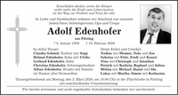 Einschlafen dürfen, wenn der Körper nicht mehr die Kraft zum Leben besitzt, ist der Weg zur Freiheit und Trost für alle. In Liebe und Dankbarkeit nehmen wir Abschied von unserem lieben Vater, Schwiegervater, Opa und Uropa Adolf Edenhofer aus Pilsting * 8. Januar 1939 + 19. Februar 2026 In stiller Trauer: Deine Enkel und Urenkel: Claudia Schmid, Tochter mit Sepp Nadine mit Thomas, Nola und Zoe Helmut Edenhofer, Sohn mit Ulrike Sabrina mit Felix, Ferdi und Konsti Gerhard Edenhofer, Sohn Nina mit Christoph und Jonathan Christine Edenhofer, Schwiegertochter Patrick mit Kathrin, Raphael und Julian Alfons Edenhofer, Bruder mit Familie Melina mit Michael, Hanni und Ida im Namen aller Verwandten Lukas mit Martha, Simon mit Katharina Trauergottesdienst am Montag, den 2. März 2026, um 10.00 Uhr in der Pfarrkirche in Pilsting mit anschließender Urnenbestattung. Für bereits erwiesene und noch zugedachte Anteilnahme bedanken wir uns herzlich.