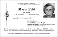 Wenn die Kraft zu Ende geht, ist es kein Sterben, sondern Erlösung. Maria Eibl geb. Straßer * 16. März 1940 _ 6. November 2025 Aign, den 17. November 2025 In stiller Trauer: Josef Eibl, Sohn, mit Margit Melanie, Franziska und Nicole, Enkelkinder im Namen aller Verwandten Der Rosenkranz findet am Mittwoch, 19. November 2025, um 13.30 Uhr in Feld­kirchen statt, danach Trauergottesdienst um 14 Uhr mit anschl. Urnenbeisetzung. Für bereits erwiesene und noch zugedachte Anteilnahme danken wir.