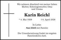 Wir nehmen Abschied von meiner lieben Mutter, Schwiegermutter, Oma und Uroma Karin Reichl * 4. Mai 1939 _ 6. April 2026 In Liebe: Susi Zöttl mit Familie Die Urnenbeisetzung findet im engsten Familienkreis statt.