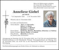 Wenn sich Mutteraugen schließen, ihr treues Herz im Tode bricht, dann wird ein schönes Band zerrissen, denn Mutterlieb' ersetzt man nicht. Anneliese Giehrl geb. Rösch * 24. September 1931 _ 19. November 2025 Wiesent, den 21. November 2025 In Liebe und Dankbarkeit: Deine Kinder: Alois und Alexandra Robert und Beate Elisabeth und Michael Bernhard und Danny Deine Enkel: Katharina, Martina, Maximilian, Sebastian und Sabrina Deine Urenkel: Maresa, Ottilie und Gabriel Dein Bruder Heinrich mit Familie im Namen aller Verwandten Aussegnung am Samstag, den 22. November 2025, um 17.45 Uhr mit anschließendem Sterberosenkranz in der Pfarrkirche Wiesent. Trauergottesdienst am Montag, den­ 24. November 2025, um 14.30 Uhr in der Pfarrkirche Wiesent mit anschließender ­Beerdigung. Von Beileidsbezeigungen am Grabe bitten wir Abstand zu nehmen.