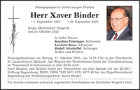 Heimgegangen in Gottes ewigen FriedenHerr Xaver Binder* 1. September 1932 _ 30. September 2025Seign, Mallersdorf, Stippich,den 14. Oktober 2025In tiefer Trauer:Karolina Paintinger, SchwesterLiselotte Runz, SchwesterRudolf Altschäffel, SchwagerNeffen und NichtenTrauergottesdienst am Freitag, 17. Oktober 2025, um 14.30 Uhr in der PfarrkircheSt. Laurentius in Haibach. Auf Wunsch des Verstorbenen findet die Urnenbestattung im Trauerwald in Schwarzach in aller Stille statt.Statt Blumen und Kränze bittet der Verstorbene um eine Spende für die KUNO - Stiftung Regensburg, IBAN: DE*** bei der HypoVereinsbank Regensburg mit Verwendungszweck: Xaver Binder.Für bereits erwiesene und noch zugedachte Anteilnahme ein herzliches Vergelt's Gott.