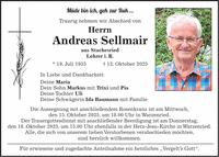Müde bin ich, geh zur Ruh ... Traurig nehmen wir Abschied von Herrn Andreas Sellmair aus Stachesried Lehrer i. R. * 19. Juli 1935 + 12. Oktober 2025 In Liebe und Dankbarkeit: Deine Maria Dein Sohn Markus mit Trixi und Pia Deine Tochter Uli Deine Schwägerin Ida Baumann mit Familie Die Aussegnung mit anschließendem Rosenkranz ist am Mittwoch, den 15. Oktober 2025, um 18.00 Uhr in Warzenried. Der Trauergottesdienst mit anschließender Beerdigung ist am Donnerstag, den 16. Oktober 2025, um 15.00 Uhr ebenfalls in der Herz-Jesu-Kirche in Warzenried. Alle, die sich von unserem lieben Verstorbenen verabschieden möchten, sind herzlich willkommen. Für erwiesene und zugedachte Anteilnahme ein herzliches ,,Vergelt's Gott'.
