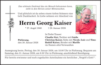 Das schönste Denkmal das ein Mensch bekommen kann, steht in den Herzen seiner Mitmenschen. Und plötzlich ist da neben einem tiefem Schmerz eine tiefe Dankbarkeit. In Liebe nehmen wir Abschied von Herrn Georg Kaiser * 27. Augst 1948 + 28. Januar 2026 In Tiefer Trauer: Claudia Sixt, Tochter mit Guido Christian Kaiser, Sohn mit Nicole, Luis und Timo Rudolf Kaiser, Bruder mit Marille im Namen aller Verwandten Aussegnung heute, Freitag, den 30. Januar 2026, um 18.00 Uhr in Pürkwang. Requiem am Samstag, den 31. Januar 2026, um 9.30 Uhr in Pürkwang, anschließend Beerdigung. Für bereits erwiesene und noch zugedachte Anteilnahme ein herzliches 'Vergelt's Gott!'.Pürkwang, den 30. Januar 2026