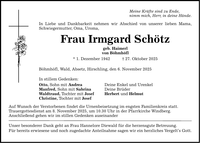 Meine Kräfte sind zu Ende, nimm mich, Herr, in deine Hände. In Liebe und Dankbarkeit nehmen wir Abschied von unserer lieben Mama, Schwiegermutter, Oma, Uroma, Frau Irmgard Schötz geb. Haimerl von Böhmhöfl * 1. Dezember 1942 _ 27. Oktober 2025 Böhmhöfl, Wald, Absetz, Hirschling, den 6. November 2025 In stillem Gedenken: Otto, Sohn mit Andrea Deine Enkel und Urenkel Manfred, Sohn mit Sabrina Deine Brüder Waldtraud, Tochter mit Josef Herbert und Helmut Christine, Tochter mit Josef Auf Wunsch der Verstorbenen findet die Urnenbeisetzung im engsten Familienkreis statt. Trauergottesdienst am 8. November 2025, um 10.30 Uhr in der Pfarrkirche Windberg. Anschließend gehen wir im stillen Gedenken auseinander Unser besonderer Dank geht an Frau Hannelore Diewald für die herzensgute Betreuung. Für bereits erwiesene und noch zugedachte Anteilnahme sagen wir ein herzliches Vergelt's Gott.