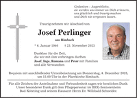 Gedanken - Augenblicke,sie werden uns immer an Dich erinnern,uns glücklich und traurig machenund Dich nie vergessen lassen.Traurig nehmen wir Abschied vonJosef Perlingeraus Rimbach* 6. Januar 1940 _ 23. November 2025Dankbar für die Zeit,die wir mit ihm verbringen durftenJosef, Inge, Romana und Peter mit Familienund alle VerwandtenRequiem mit anschließender Urnenbeisetzung am Donnerstag, 4. Dezember 2025, um 15.00 Uhr in der Pfarrkirche Rimbach.Für alle Zeichen der Anteilnahme und Verbundenheit sagen wir herzlichen Dank. Unser besonderer Dank gilt dem Pflegepersonal im BRK-SeniorenheimBad Kötzting und seinem Hausarzt Herrn Dr. Willibald Schneider.