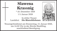 Slawena Krassnig * 23. Dezember 1929 + 5. Januar 2026 In stiller Trauer: Landshut Die Hinterbliebenen Trauergottesdienst am Donnerstag, 15. Januar 2026, um 14.00 Uhr in der Kirche Haidlfing, anschließend Beerdigung.