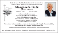 In Liebe und Dankbarkeit nehmen wir Abschied von unserer lieben Mama, Schwiegermutter und Oma Margarete Butz geborene Schreiber * 02. 01. 1931 _ 10. 11. 2025 In liebevoller Erinnerung: Deine Tochter Renate mit Mathias Dein Sohn Hans mit Angelika Deine Enkelin Kerstin mit Benjamin Deine Enkelin Andrea mit Stefan Dein Enkel Thomas mit Sina Trauerfeier mit anschließender Urnenbeisetzung am Freitag, 5. Dezember 2025, um 13.00 Uhr im Friedhof Velden, neuer Teil. Von Beileidsbezeigungen am Grab bitten wir Abstand zu nehmen. Für bereits erwiesene und noch zugedachte Anteilnahme ein herzliches "Vergelt's Gott".