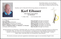 In unseren Herzen lebst Du weiter:Einschlafen dürfen, wenn der Körper nicht mehr die Kraft zum Leben besitzt,ist der Weg zur Freiheit und Trost für alle.Dankbar und in liebevoller Erinnerung nehmen wir Abschied vonKarl Eibauerehem. Bäcker und Landwirt aus Altenbuch* 5. März 1944 _ 26. November 2025Deine Renate Franz Oswald, Schwager mit FamilieMarianne Thöne, Schwester Josef Oswald, Schwager mit Familie Irma Wallenta, Schwester mit Familie Rupert Oswald, Schwager mit FamilieBarbara Eibauer, Schwägerin mit Familie Erna Hämmerl, Schwägerin mit FamiliePaul und Margarete Thöne mit Johannes und Susanne Christa Wendl, Schwägerin mit Heinrichim Namen aller Verwandten Hans Oswald, Schwager mit ChristaSterberosenkranz am Dienstag, 2. Dezember 2025, um 18.00 Uhr in Altenbuch. Trauergottesdienst am Mittwoch,3. Dezember 2025, um 10.30 Uhr in der Pfarrkirche in Altenbuch mit anschließender Urnenbestattung.Anstelle von Blumen bitten wir um eine Spende an den Pflegedienst