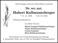 Nach langer, schwerer Krankheit verstarb Dr. rer. nat. Hubert Kollmannsberger * 11. 12. 1958 + 28. 10. 2025 Volkmannsdorferau In stiller Trauer: Hanni Gammel-Kollmannsberger Simon Kollmannsberger Catrin Gammel Hans Kollmannsberger Trauerfeier mit Urnenbestattung am Freitag, 5. Dezember 2025, um 14 Uhr im Friedhof Volkmannsdorf.