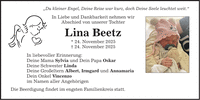 "Du kleiner Engel, Deine Reise war kurz, doch Deine Seele leuchtet weit." In Liebe und Dankbarkeit nehmen wir Abschied von unserer Tochter Lina Beetz * 24. November 2025 _ 24. November 2025 In liebevoller Erinnerung: Deine Mama Sylvia und Dein Papa Oskar Deine Schwester Linda Deine Großeltern Albert, Irmgard und Annamaria Dein Onkel Vincenzo im Namen aller Angehörigen Die Beerdigung findet im engsten Familienkreis statt.