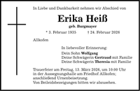 In Liebe und Dankbarkeit nehmen wir Abschied von Erika Heiß geb. Burgmayer * 3. Februar 1935 _ 24. Februar 2026 Allkofen In liebevoller Erinnerung: Dein Sohn Wolfgang Deine Schwägerin Gertraud mit Familie Deine Schwägerin Theresia mit Familie Trauerfeier am Freitag, 13. März 2026, um 10.00 Uhr in der Aussegnungshalle am Friedhof Allkofen; anschließend Urnenbeisetzung. Von Beileidsbezeigungen bitten wir abzusehen.