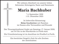Wir nehmen Abschied von unserer lieben Schwester, Schwägerin, Tante und Patentante Maria Bachhuber * 4. September 1959 + 31. Dezember 2025 In liebevoller Erinnerung: Deine Geschwister mit Familien im Namen aller Verwandten und Freunde Der Trauergottesdienst findet am Samstag, 17. Januar 2026, um 10 Uhr in der Pfarrkirche in Furth statt. Die Urnenbeisetzung ist im Anschluss im Friedhof in Furth. Ein herzliches Vergelt's Gott für alle Zeichen der Anteilnahme.