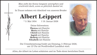 Man sieht die Sonne langsam untergehen und erschrickt doch, wenn es plötzlich dunkel ist. In Trauer nehmen wir Abschied von unserem Bruder Albert Leippert * 3. Mai 1954 + 10. Januar 2026 Deine Schwestern: Theresa mit Familie Maria mit Familie Christl mit Familie Ingrid mit Familie Hedwig mit Familie Elisabeth mit Familie Die Urnenbeisetzung findet am Dienstag, 3. Februar 2026, um 12 Uhr im Nordfriedhof Landshut statt. Allen, die Albert im Leben schätzten und im Tode ehren herzlichen Dank.