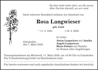 Du bist nicht mehr dort, wo Du warst. Aber Du bist überall, wo wir sind. Nach schwerer Krankheit nehmen wir Abschied von Rosa Langwieser geb. Guth * 11. 4. 1945 + 24. 2. 2026 In Liebe: Anton Langwieser mit Annika Angela Langwieser Maria Dobner mit Familie im Namen aller Angehörigen Trauergottesdienst am Mittwoch, 11. März 2026, um 14.00 Uhr in Günzkofen.Die Urnenbestattung findet im Familienkreis statt. Für bereits erwiesene und noch zugedachte Anteilnahme danken wir herzlich.Günzkofen, den 7. März 2026