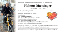 Nach kurzer und schwerer Krankheit nehmen wir Abschied von Helmut Massinger * 28. 1. 1966 + 25. 3. 2026 Feuchten, den 16. April 2026 In unseren Herzen lebst Du weiter: Deine Conny Dein Philipp mit Antonia Dein Bruder Hans mit Luise und Familie Deine Schwägerin Uschi mit Familie Dein Schwiegervater Sigi mit Elfi Deine Schwäger Siggi, Jürgen und Günther mit Familien im Namen aller Verwandten und Angehörigen Requiem am Samstag, 18. April 2026, um 10 Uhr in der Kirche Paindlkofen. Die Urnenbeisetzung findet im engsten Familienkreis statt. Für bereits erwiesene und noch zugedachte Anteilnahme herzlichen Dank.