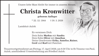Unsere liebe Mam bleibt für immer in unseren Herzen. Christa Kronwitter geborene Aufleger * 22. 12. 1944 + 30. 3. 2026 Landshut-Auloh Es vermissen Dich: Dein Sohn Markus mit Sandra Dein Sohn Oliver mit Jonathan Deine Geschwister Erika, Annelise, Rainer, Gerd und Karl mit Familien Trauerwortgottesdienst am Freitag, 17. April 2026, um 9.30 Uhr in St. Vinzenz von Paul, Auloh, anschließend Urnenbestattung am Friedhof Auloh.