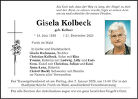 Als Gott sah, dass der Weg zu lang, der Hügel zu steilund der Atem zu schwer wurde, legte er seinen Armum sie und schenkte ihr seinen Frieden.Gisela Kolbeckgeb. Kellner* 18. Juni 1938 _ 21. Dezember 2025Furth im WaldIn Liebe und Dankbarkeit:Gisela Oschmann, TochterChristian Kolbeck, Sohn mit RitaYvonne, Enkelin mit Ludwig, Lilly und LuisSven, Enkel mit Christina, Julian und LeniAnna-Lena, EnkelinChristl Hackl, Schwester mit Familieim Namen aller VerwandtenDer Trauergottesdienst ist am Freitag, den 2. Januar 2026, um 10.00 Uhr in derStadtpfarrkirche Furth im Wald, anschließend Urnenbeisetzung.Für alle Zeichen der Anteilnahme sagen wir ein ganz herzliches Vergelt's Gott.