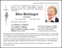 Von guten Mächten wunderbar geborgen. In Liebe und Dankbarkeit nehmen wir Abschied von unserer herzensguten Mutter, Schwiegermutter, Oma, Schwester, Schwägerin und Tante Rita Reitinger geb. Bumes * 25. August 1939 _ 28. März 2026 Groß, den 4. April 2026 Dein Konrad mit Christine Deine Gabi mit Ludwig Deine Beate mit Thomas Maria mit Mario, Ludwig mit Steffi Monika, Eva und Pia Aussegnung mit anschließendem Sterberosenkranz am Dienstag, den 7. April 2026, um 18.00 Uhr in Haindling. Requiem am Mittwoch, den 8. April 2026, um 14.30 Uhr in der Wallfahrtskirche, anschließend Beerdigung. Anstelle von Blumen und Kränzen bitten wir um eine Spende für die Wallfahrtskirche Haindling, IBAN: DE***; Kennwort: Rita Reitinger. Allen, die ihr im Leben verbunden waren und sie im Tode ehren, sagen wir herzlichen Dank. Dein Bruder Georg mit Ziska Dein Bruder Hans mit Erika Deine Schwägerin Else im Namen aller Verwandten