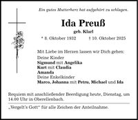 Ein gutes Mutterherz hat aufgehört zu schlagen. Ida Preuß geb. Klarl * 8. Oktober 1932 _ 10. Oktober 2025 Mit Liebe im Herzen lassen wir Dich gehen: Deine Kinder Sigmund mit Angelika Kurt mit Claudia Amanda Deine Enkelkinder Marco, Johanna mit Petru, Michael und Ida Requiem mit anschließender Beerdigung heute, Dienstag, um 14.00 Uhr in Oberellenbach. "Vergelt's Gott" für alle Zeichen der Anteilnahme.