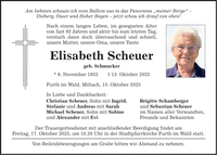Am liebsten schaute ich vom Balkon aus in das Panorama "meiner Berge" - Dieberg, Osser und Hoher Bogen - jetzt schau ich drauf von oben! Nach einem langen Leben, im gesegneten Alter von fast 92 Jahren und aktiv bis zum letzten Tag, verstarb dann doch überraschend und schnell, unsere Mutter, unsere Oma, unsere Tante Elisabeth Scheuer geb. Schmucker * 9. November 1933 _ 13. Oktober 2025 Furth im Wald, Miltach, 15. Oktober 2025 In Liebe und Dankbarkeit: Christian Scheuer, Sohn mit Ingrid, Brigitte Schamberger Stefanie und Andreas mit Sarah und Sebastian Scheuer Michael Scheuer, Sohn mit Sabine im Namen aller Verwandten, und Alexander mit Evi Freunde und Bekannten Der Trauergottesdienst mit anschließender Beerdigung findet am Freitag, 17. Oktober 2025, um 10.30 Uhr in der Stadtpfarrkirche Furth im Wald statt. Von Beileidsbezeugungen am Grabe bitten wir Abstand zu nehmen.