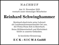 nachruf Am 15. November 2025 verstarb unser ehemaliger Mitarbeiter Reinhard Schwinghammer Reinhard absolvierte seine Lehrzeit als Landmaschinenmechaniker bei uns, der Firma Franz Eck in Baierbach. Seine Hilfsbereitschaft und Ehrlichkeit bleibt in unseren Gedanken. In herzlicher Erinnerung E C K - S I C M A GmbH