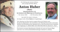 Der Mittelpunkt meines Lebens, mein innigst geliebter Mann Anton Huber ( Toni ) Abteilungsdirektor a. D. für Schulen in der Regierung von Niederbayern * 23. Januar 1940 + 29. November 2025 hat mich für immer verlassen. In ewiger Liebe: Deine Karin mit Angehörigen Der Abschied von Toni fand im engsten Kreis der Familie statt. Es gibt die Möglichkeit, die Grabstelle in der Waldruh Kronwinkl zu besuchen. Bereich A6, Kirschbaum 652. Spenden bitte an den Tierschutzverein Landshut und Umgebung e.V., IBAN DE***, Kennwort: 'Toni'. Für bereits erwiesene Kondolenzen bedanke ich mich auf diesem Wege und bitte von weiteren Beileidsbekundungen Abstand zu nehmen.