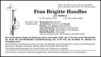 Wenn die Sonne des Lebens untergeht, dann leuchten die Sterne der Erinnerung. Frau Brigitte Handlos geb. Mißlbeck * 9. November 1953 _ 26. November 2025 In Liebe und Tanja Orywal, Tochter Dankbarkeit: Astrid Karl, Tochter mit Charly Pauline und Anton, Enkelkinder Anita Heubach, Schwägerin mit Familie Christine Zankl, Schwägerin mit Familie Rudolf Handlos, Schwager und im Namen aller Verwandten und Freunden Der Gottesdienst findet am Dienstag, den 9. Dezember 2025, um 12.45 Uhr in der Pfarrkirche St. Josef mit anschließender Urnenbeisetzung um 14.00 Uhr am Friedhof St. Michael in Straubing statt. Statt Blumen und Kränze bitten wir um eine Spende an das Hospiz St. Ursula in Niederalteich. Kennwort: Brigitte Handlos, IBAN DE***. Von Beileidsbezeigungen am Grab bitten wir Abstand zu nehmen. Für bereits erwiesene und noch zugedachte Anteilnahme bedanken wir uns herzlich