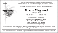 'Das Schönste, was ein Mensch hinterlassen kann, ist ein Lächeln im Gesicht derjenigen, die an ihn denken.' In Liebe und Dankbarkeit nehmen wir Abschied von Gisela Woywod geborene Matz * 31. 8. 1947 + 1. 12. 2025 In liebevoller Erinnerung: Deine Tochter Franca mit Bernt Deine Enkel Leyla mit Elvin, Alan mit Jessica und Marlon im Namen aller Angehörigen Trauerfeier mit anschließender Beerdigung am Donnerstag, den 11. Dezember 2025, um 13.00 Uhr im Hauptfriedhof Landshut. Für bereits erwiesene und noch zugedachte Anteilnahme bedanken wir uns herzlich.