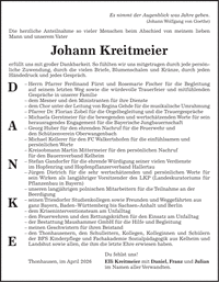 Es nimmt der Augenblick was Jahre geben. (Johann Wolfgang von Goethe) Die herzliche Anteilnahme so vieler Menschen beim Abschied von meinem lieben Mann und unserem Vater Johann Kreitmeier erfüllt uns mit großer Dankbarkeit. So fühlten wir uns mitgetragen durch jede persönliche Zuwendung, durch die vielen Briefe, Blumenschalen und Kränze, durch jeden Händedruck und jedes Gespräch. - Herrn Pfarrer Ferdinand Fürst und Rosemarie Fischer für die Begleitung auf seinem letzten Weg sowie die würdevolle Trauerfeier und mitfühlenden Gespräche in unserer Familie - dem Mesner und den Ministranten für ihre Dienste - dem Chor unter der Leitung von Regina Gehde für die musikalische Umrahmung - Pfarrer Dr. Florian Zobel für die Orgelbegleitung und die Trauergespräche - Michaela Gerstmeier für die bewegenden und wertschätzenden Worte für sein herausragendes Engagement für die Bayerische Jungbauernschaft - Georg Huber für den ehrenden Nachruf für die Feuerwehr und den Schützenverein Oberwangenbach - Michael Kellerer für den FC Walkertshofen für die einfühlsamen und persönlichen Worte - Kreisobmann Martin Mittermeier für den persönlichen Nachruf für den Bauernverband Kelheim - Stefan Gandorfer für die ehrende Würdigung seiner vielen Verdienste im Hopfenring und Hopfenpflanzerverband Hallertau - Jürgen Dietrich für die sehr wertschätzenden und persönlichen Worte für sein Wirken als langjähriger Vorsitzender des LKP (Landeskuratoriums für Pflanzenbau in Bayern) - unseren langjährigen polnischen Mitarbeitern für die Teilnahme an der Beerdigung - seinen Triesdorfer Studienkollegen sowie Freunden und Weggefährten aus ganz Bayern, Baden-Württemberg bis Sachsen-Anhalt und Berlin - dem Kriseninterventionsteam am Unfalltag - den Feuerwehren und den Rettungskräften für den Einsatz am Unfalltag - der Bestattung Maushammer GmbH für die Hilfe und Begleitung - meinen Geschwistern für ihren Beistand - den Thonhausenern, den Schulleitern, Kollegen, Kolleginnen und Schülern der BFS Kinderpflege und Fachakademie Sozialpädagogik