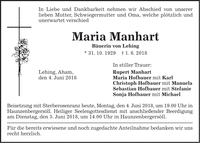 In Liebe und Dankbarkeit nehmen wir Abschied von unserer lieben Mutter, Schwiegermutter und Oma, welche plötzlich und unerwartet verschied Maria Manhart Bäuerin von Lehing * 31. 10. 1929 + 1. 6. 2018 In stiller Trauer: Lehing, Aham, Rupert Manhart den 4. Juni 2018 Maria Hofbauer mit Karl Christoph Hofbauer mit Manuela Sebastian Hofbauer mit Stefanie Sonja Hofbauer mit Michael Beisetzung mit Sterberosenranz heute, Montag, den 4. Juni 2018, um 19.00 Uhr in Haunzenbergersöll. Heiliger Seelengottesdienst mit anschließender Beerdigung am Dienstag, den 5. Juni 2018, um 14.00 Uhr in Haunzenbergersöll. Für die bereits erwiesene und noch zugedachte Anteilnahme bedanken wir uns recht herzlich.