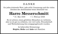 DANKE für jedes tröstende Wort, jede stille Umarmung und die vielen Zeichen der Anteilnahme beim Abschied von Harro Messerschmitt * 21. Mai 1939 _ 1. Februar 2026 Es ist schwer, einen geliebten Menschen zu verlieren, aber es ist gut zu erfahren, wie viel Liebe, Freundschaft und Wertschätzung ihm entgegengebracht wurden. In liebevoller Erinnerung: Brigitte, Heike und Anke mit Familien
