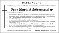 DANKSAGUNG Zum Heimgang meiner lieben Mutter, Schwiegermutter, unserer lieben Oma und Uroma Frau Maria Schützenmeier sagen wir herzlichen Dank: - den Verwandten, Freunden, Nachbarn und Bekannten für die Beileidsbezeigungen in Wort und Schrift und die Teilnahme am Trauergottesdienst mit Urnenbeisetzung - H. H. Pfarrer Johannes Hofmann für die würdige Gestaltung der Trauerfeierlichkeiten - der Mesnerin Frau Kindsmüller und dem Organisten - dem BRK Seniorenheim Ergoldsbach für die stets umsichtige Betreuung und Pflege in den letzten Jahren - dem Notarztteam für die Hilfe und der Palliativstation der Klinik Mallersdorf für die gute und einfühlsame Betreuung in ihren letzten Tagen - dem Katholischen Frauenbund Langquaid, den Spielhahnschützen Langquaid und dem Obst- und Gartenbauverein Langquaid für das ehrende Geleit. Langquaid / Niederlindhart, im März 2026Sieglinde Münch, Tochter mit Familie