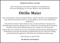 Herzlichen Dank allen Verwandten, Freunden, Nachbarn und Bekannten, die beim Heimgang von unserer Mutter und Großmutter Ottilie Maier ihre Anteilnahme durch tröstende Worte, Schrift, Blumen und Geldspenden zum Ausdruck brachten und sie auf dem Weg zu ihrer letzten Ruhestätte begleiteten. Besonderer Dank H. Herrn Pfarrer Siju, H. Herrn Pfarrer Zinecker, der Musikgruppe Zusammenklang für die würdevolle Gestaltung der Trauerfeier und dem Frauenbund Rottenburg an der Laaber für die Grabrede. Ebenso gilt unser Dank der Caritas-Sozialstation Rottenburg-Pfeffenhausen-Hohenthann und dem Krankenhaus Mallersdorf für die liebevolle Pflege; und dem Bestattungsinstitut Heiß für die einfühlsame Betreuung. Rottenburg, im April 2026 Die Kinder mit Familien