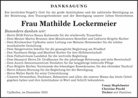 DANKSAGUNG Ein herzliches Vergelt's Gott für die große Anteilnahme und die zahlreiche Beteiligung an der Beisetzung, dem Trauergottesdienst und der Beerdigung unserer lieben Verstorbenen Frau Mathilde Lockermeier Besonders danken wir: - Herrn BGR Patrice Banza Kabwende für die würdevolle Trauerfeier - Dem Mesner Martin Brunner, dem Ministranten Benedikt und Lektorin Brigitte Korber - Dem Kirchenchor Upfkofen unter Leitung von Melanie Hetzenecker für die schöne musikalische Gestaltung - Dem Sängerverein Inkofen für die gesangliche Begleitung am Friedhof - Den Nachbarn Helga und Manfred Korber für ihre Hilfsbereitschaft - Dem Palliativteam Landshut für die wertvolle Begleitung - Dem Hausarzt Herrn Dr. Großhauser für die jahrelange Betreuung und stete Bereitschaft - Dem Azurit-Seniorenzentrum Neufahrn für die langjährige liebevolle Pflege - Frau Brigitte Korber, Vorsitzende des lebendigen Rosenkranzes, für den ehrenden Nachruf - Herrn Johann Hornung für die Begleitung bei der Beerdigung - Herrn Walter Barth für seine Unterstützung - Unseren Verwandten, Nachbarn, Bekannten und allen, die unserer Mama das letzte Geleit gegeben haben und ihre Anteilnahme in Wort und Schrift bekundeten. Conny Hapfelmeier Christine Pöschl Upfkofen, im Dezember 2025 Töchter mit Familien