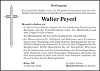 Danksagung Ein herzliches Vergelt's Gott für die große Anteilnahme und die viel-fältige Unterstützung beim Abschied von unserem lieben Verstorbenen Walter Peyerl Besonders danken wir: - H. Herrn Pater Fabian Jürgens für die würdevolle Gestaltung des Requiems und der Urnenbeisetzung sowie den Ministranten und dem Träger für ihre Dienste - der Musikkapelle für die schöne musikalische Umrahmung - der Hausarztpraxis Dr. Schinhanl und Rothbauer samt Praxisteam für die gute Versorgung, dem Team Palliamo Regensburg für die einfühlsame Begleitung, ebenso den Ärzten und dem Pflegepersonal der Barmherzigen Brüder Regensburg für die fürsorgliche Betreuung - der Fa. Hofschuster und den Arbeitskollegen, der Freiwilligen Feuerwehr Oberbuch sowie allen Verwandten, Bekannten, Freunden, die ihre Anteilnahme in Wort und Schrift zum Ausdruck brachten und ihn auf seinem letzten Weg begleiteten. Rohr i.NB In stiller Trauer: im Februar 2026 Mathilde Peyerl mit Familie
