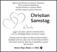 Manchmal bis Du in unseren Träumen, oft in unseren Gedanken. Du bist immer in unserer Mitte und für ewig in unseren Herzen. Christian Samstag Danke sagen wir allen, die ihre Anteilnahme auf so vielfältige Weise erwiesen haben. Traurig sind wir, dass wir Dich verloren haben. Dankbar sind wir, dass wir mit Dir leben durften. Getröstet sind wir, dass Du in Gedanken weiter bei uns bist. Mama, Papa, Mausi und Mina _