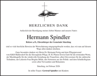 Herzlichen Dank Anlässlich der Beerdigung meines lieben Mannes und unseres Vaters Hermann Spindler Rektor a. D., Ehrenbürger der Gemeinde Sünching sind so viele herzliche Beweise der Wertschätzung entgegengebracht worden, dass wir nun auf diesem Wege allen danken möchten. Ganz besonders danken wir Herrn Dr. Hermann Fertig und dem Pflegepersonal vom KKH Mallersdorf für die fürsorgliche Pflege, H. H. Pfarrer Erwin Gietl für die tröstenden Worte, der Musikkapelle für die würdevolle Gestaltung der Trauerfeier, allen Ortsvereinen für die zahlreiche Teilnahme, der Lektorin Frau Brigitte Milde, den Vertretern aus der Politik und dem Schulkollegium sowie allen Verwandten und Bekannten. Sünching, im Februar 2026 In stiller Trauer: Gertrud Spindler mit Kindern