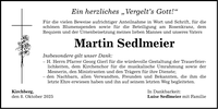 Kirchberg, den 8. Oktober 2025 Ein herzliches "Vergelt's Gott!" Für die vielen Beweise aufrichtiger Anteilnahme in Wort und Schrift, für die schönen Blumenspenden sowie für die Beteiligung am Rosenkranz, dem Requiem und der Urnenbeisetzung meines lieben Mannes und unseres Vaters Martin Sedlmeier Insbesondere gilt unser Dank: - H. Herrn Pfarrer Georg Gierl für die würdevolle Gestaltung der Trauerfeierlichkeiten, dem Kirchenchor für die musikalische Umrahmung sowie der Mesnerin, den Ministranten und den Trägern für ihre Dienste; - den Nachbarn, allen Verwandten, Freunden und Bekannten, die ihm die letzte Ehre erwiesen haben und ihn auf seinem letzten Weg begleiteten. In Dankbarkeit: Luise Sedlmeier mit Familie