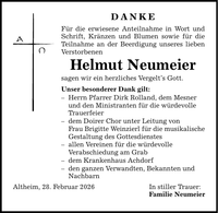 DANKE Für die erwiesene Anteilnahme in Wort und Schrift, Kränzen und Blumen sowie für die Teilnahme an der Beerdigung unseres lieben Verstorbenen Helmut Neumeier sagen wir ein herzliches Vergelt's Gott. Unser besonderer Dank gilt: - Herrn Pfarrer Dirk Rolland, dem Mesner und den Ministranten für die würdevolle Trauerfeier - dem Doirer Chor unter Leitung von Frau Brigitte Weinzierl für die musikalische Gestaltung des Gottesdienstes - allen Vereinen für die würdevolle Verabschiedung am Grab - dem Krankenhaus Achdorf - den ganzen Verwandten, Bekannten und Nachbarn Altheim, 28. Februar 2026 In stiller Trauer: Familie Neumeier