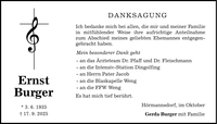 Ernst Burger * 3. 6. 1935 _ 17. 9. 2025 Danksagung Ich bedanke mich bei allen, die mir und meiner Familie in mitfühlender Weise ihre aufrichtige Anteilnahme zum Abschied meines geliebten Ehemannes entgegengebracht haben. Mein besonderer Dank geht - an das Ärzteteam Dr. Pfaff und Dr. Fleischmann - an die Intensiv-Station Dingolfing - an Herrn Pater Jacob - an die Blaskapelle Weng - an die FFW Weng Es hat mich tief berührt. Hörmannsdorf, im Oktober Gerda Burger mit Familie