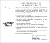Ein herzliches Vergelts Gott allen, für die vielen Beweise der Anteilnahme durch tröstende Worte oder Beileidskarten, die große Beteiligung am Trauergottesdienst und der Beisetzung sowie für die Blumenspenden, einen Händedruck, eine stumme Umarmung, wenn die Worte fehlten. Unser besonderer Dank gilt: - Herrn Diakon Hobelsberger und dem Chor für die feier- liche Gestaltung des Trauergottesdienstes; - Herrn Dr. Feicht und seinem Praxisteam für die gute hausärztliche Betreuung; - dem Donau-Isar-Klinikum in Deggendorf und Landau für die fürsorgliche Pflege; - dem Caritas-Team für die einfühlsame Versorgung; - den Schäfflern für die Erweisung der letzten Ehre; - dem Bestattungsinstitut Rempfer für die große Hilfe- leistung; - allen Verwandten, Freunden, Bekannten und Nachbarn für die Begleitung und Unterstützung. Landau/Isar, im September 2015 In liebevoller Erinnerung: Renate Thurl Thomas Thurl im Namen aller AngehörigenGünther Thurl