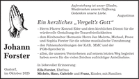 Auferstehung ist unser Glaube, Wiedersehen unsere Hoffnung, Gedenken unsere Liebe. Augustinus Ein herzliches 'Vergelt's Gott' - Herrn Pfarrer Konrad Eder und dem kirchlichen Dienst für die würdevolle Gestaltung der Trauerfeierlichkeiten - dem Kirchenchor Harmonie Herrn Jan Malotta, Michael, Franz und Sophia Forster für die schöne musikalische Umrahmung - den Fahnenabordnungen der KAB, MMC und der PGR-Sprecherin - allen, die unseren Verstorbenen auf seinem letzten Weg begleitet haben sowie für die vielen Zeichen aufrichtiger Anteilnahme. In liebevoller Erinnerung: Ella Forster, Ehefrau Michele, Hans, Gabriele und Franz, Kinder, mit FamilienJohann ForsterGastorf, im Oktober 2025