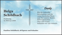Danke Für die liebevolle Anteilnahme und die vielen herzlichen Worte zum Tod unserer Mutter, Schwiegermutter, Oma und Uroma bedanken wir uns vielmals.Helga Schildbach Stallwang, im Februar 2026Familien Schildbach, deVigneux und Schauber