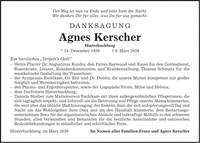 Der Weg ist nun zu Ende und leise kam die Nacht. Wir danken Dir für alles, was Du für uns gemacht. Danksagung Agnes Kerscher Hinterbuchberg * 14. Dezember 1936 + 9. März 2026 Ein herzliches 'Vergelt's Gott'' - Herrn Pfarrer Dr. Augustinus Kozdra, den Patres Raymund und Xaver für den Gottesdienst, Rosenkranz, Litanei, Krankenkommunion und Krankensalbung, Thomas Schmatz für die musikalische Gestaltung der Trauerfeier; - der Arztpraxis Eschlkam, Dr. Ettl und Dr. Dobler, die unsere Mutter kompetent mit großer Sorgfalt und Warmherzigkeit betreuten; - den Physio- und Ergotherapeuten, sowie der Logopädie Vivien, Milos und Helena; - dem Dorfverein Hinterbuchberg; - Daniela Stoiber vom Marienverein Eschlkam mit ihren außergewöhnlichen Pflegerinnen, die sich tagtäglich respekt- und liebevoll um die Betreuung und Pflege unserer Mama kümmerten, die weit über das übliche Maß hinausging; der Enkelin Susi, die sich aufopferungsvoll Tag und Nacht um das Wohlergehen ihrer Oma und um den Haushalt kümmerte; dem Bestattungsunternehmen Breu für die organisatorischen Abläufe und tatkräftige Mithilfe in den schweren Stunden; allen Verwandten und Bekannten für die herzliche Anteilnahme und zahlreichen Beileidsbekundungen in mündlicher und schriftlicher Form. Hinterbuchberg, im März 2026Im Namen aller Familien Franz und Agnes Kerscher