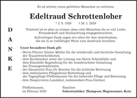 Es ist schwer, einen geliebten Menschen zu verlieren. Edeltraud Schrottenloher * 2. 8. 1928 + 26. 1. 2026 Tröstend ist es aber zu wissen, dass viele Menschen ihr so viel Liebe, Freundschaft und Hochachtung entgegenbrachten. Aufrichtigen Dank sagen wir allen für ihre Anteilnahme, die sie in so vielfältiger Weise zum Ausdruck brachten. Unser besonderer Dank gilt: - Herrn Pfarrer Günter Müller für die würdevolle und herzliche Gestaltung der Trauerfeierlichkeiten - dem Kirchenchor unter der Leitung von Herrn Schönfelder und dem Ensemble Regensburg für die wunderschöne Gestaltung des Trauergottesdienstes - der Hausärztin Frau Dr. Bracher für die ärztliche Betreuung - dem Ambulanten Pflegedienst Rottenburg und der Tagespflege Pfeffenhausen für die liebevolle Pflege und Betreuung - dem Hospizverein Landshut, insbesondere Frau Gürtner. Pfeffenhausen, Familien im Februar 2026 Schrottenloher, Thompson, Wagensonner, KernD A N K E