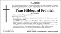 DANKE Wir möchten ein herzliches Vergelt's Gott sagen an alle Verwandten, Freunde, Nachbarn und Bekannte, die ihre Anteilnahme auf so vielfältige Weise zum Ausdruck gebracht haben und unsere liebe Mutter Frau Hildegard Fröhlich geb. Buchner auf ihrem letzten Weg begleitet haben. Besonders danken wir: - Herrn Pfarrer Pater Justine Chakkiath und allen, die die Trauerfeier so würdevoll gestaltet haben. - dem BRK Seniorenwohn- und Pflegeheim Schloss Eggmühl, vor allem den Mitarbeiterinnen und Mitarbeitern im Bereich Sinnesgarten, für die kompetente, liebevolle und mitfühlende Pflege im letzten halben Jahr - der BRK Sozialstation Schierling und der BRK Tagespflege Oase an der Laber für die kompetente und freundliche ambulante Pflege und Betreuung - dem MVZ Schierling für die langjährige medizinische Versorgung Unterdeggenbach, In stiller Trauer im Dezember 2025 Martina Gruber, Christian Fröhlich, Andreas Fröhlich